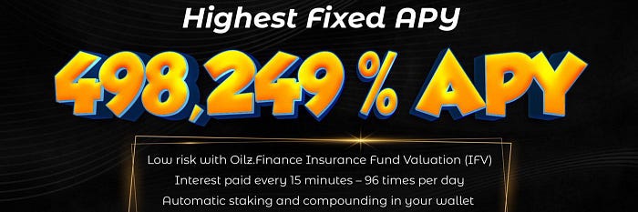 Paying Auto-Staking and Auto-Compounding Protocol with the most elevated fixed APY of 498,249% in the crypto space. Interest rewards are accumulated at regular intervals for each BSC wallet holding any $OILZ tokens